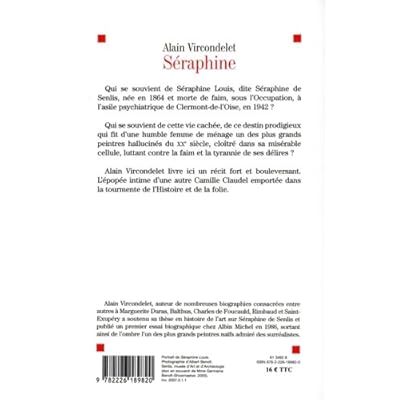 Qui se souvient de Séraphine Louis, dite Séraphine de Senlis, née en 1864 et morte de faim, sous l'Occupation, à l'asile psychiatrique de Clermont-de-l'Oise, en 1942 ?Qui se souvient de cette vie cachée, de ce destin prodigieux qui fit d'une humble femme de ménage, un des plus grands peintres hallucinés du XXe siècle, cloîtrée dans sa misérable cellule, luttant contre la faim et la tyrannie de ses délires ?Alain Vircondelet livre ici un récit fort et bouleversant. L'épopée intime d'une autre Camille Claudel emportée dans la tourmente de l'Histoire et de la folie.